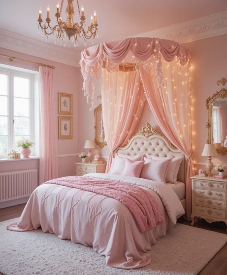 Wrap twinkling fairy lights around the bed canopy or walls. The soft glow creates a magical nighttime atmosphere Princess Bedroom.