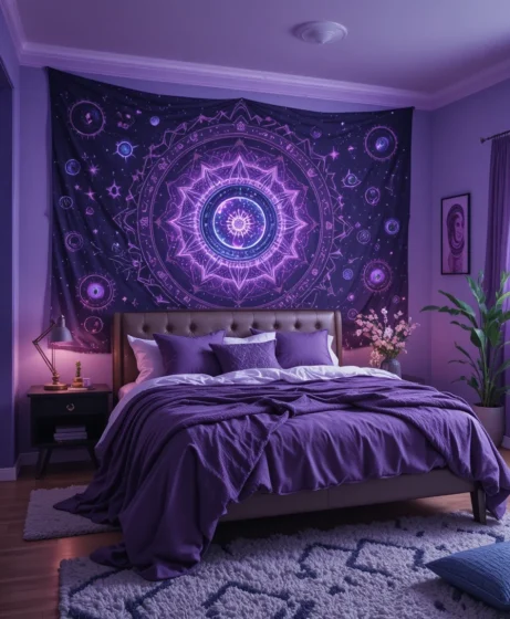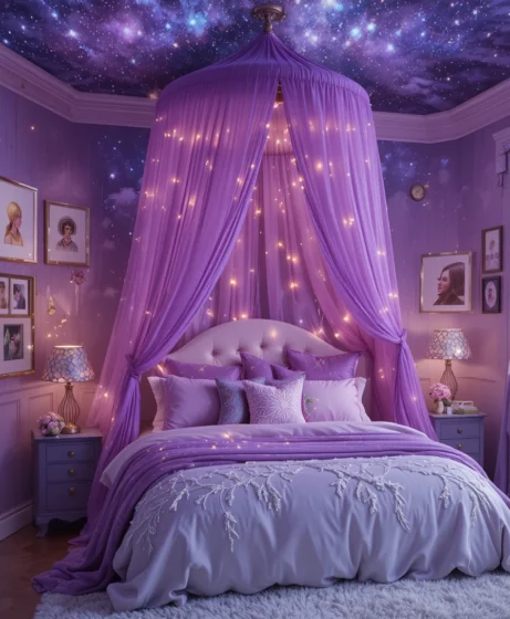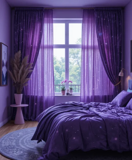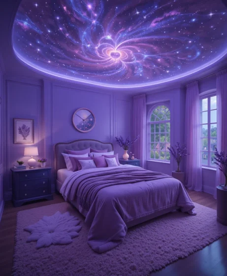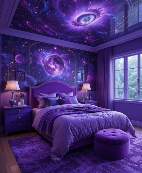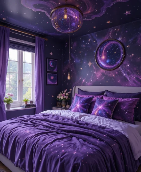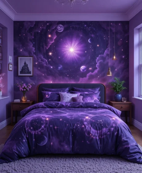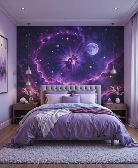 By layering deep purple tones, galaxy patterns, shimmering details, and soft lighting, you can design a space that feels calming yet visually stunning.