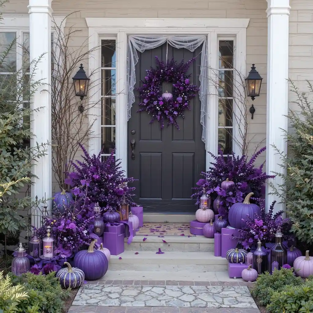 Light up your walkway with purple lanterns or LED lights for a dramatic nighttime effect. The soft glow adds an eerie yet inviting feel that works beautifully for trick-or-treaters or party guests.