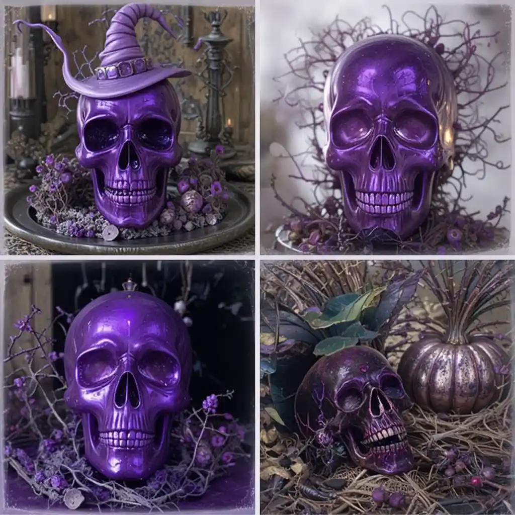 Paint skull figurines in metallic or matte purple and place them on coffee tables, shelves, or mantels. They bring a bold yet elegant edge to your Halloween displays without feeling too frightening.