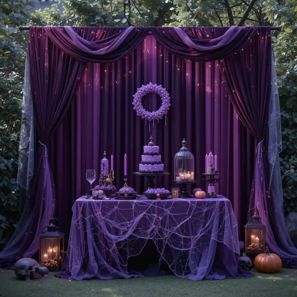 Hang deep purple curtains or fabric behind dessert tables, photo booths, or fireplace mantels. Layer with cobwebs or string lights to create a moody, dramatic backdrop perfect for Halloween parties. Purple Halloween Décor Ideas