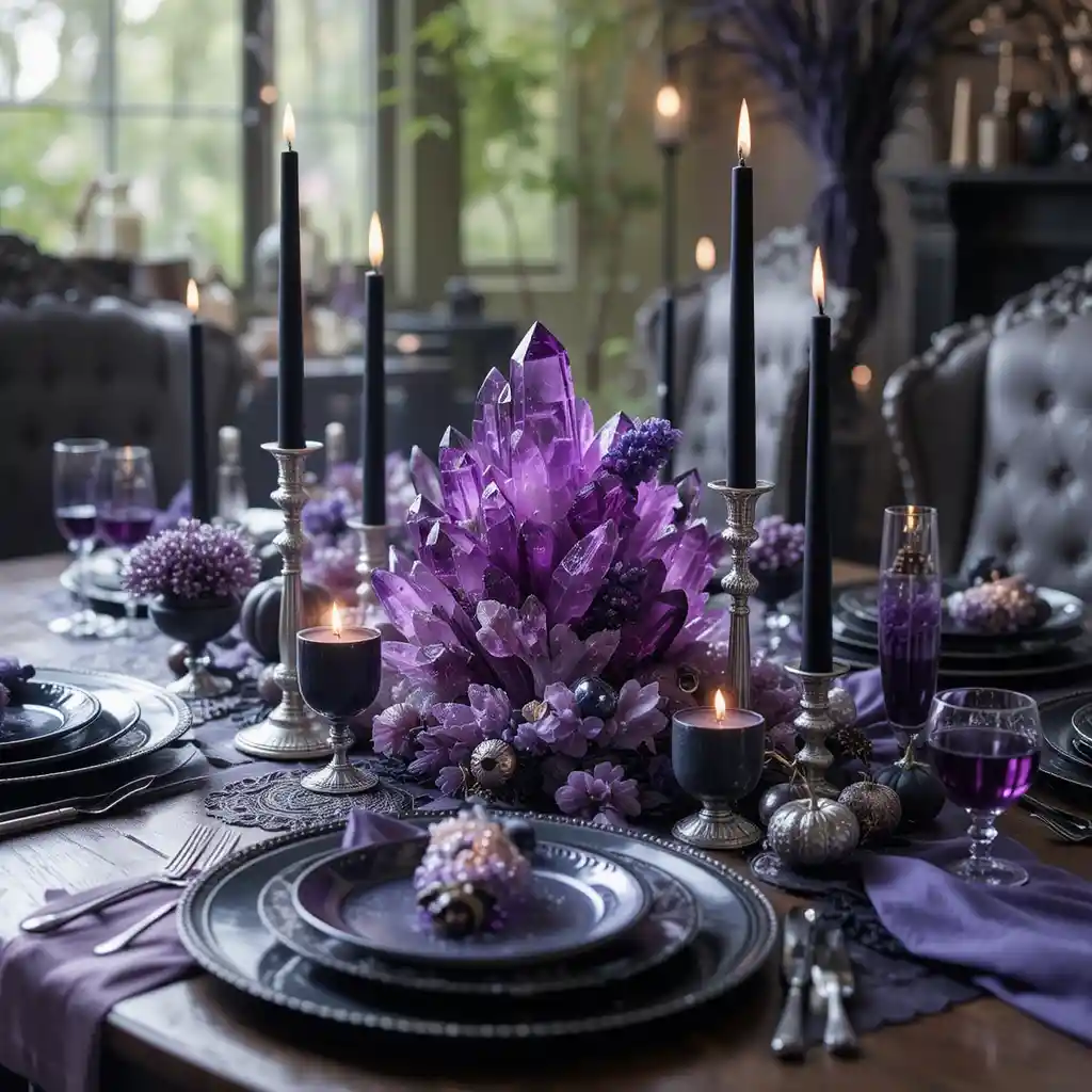 Create a magical dining table display by using amethyst crystals as the centerpiece. Surround them with black candles and silver accents for an enchanting look that blends elegance with a mystical Halloween vibe.