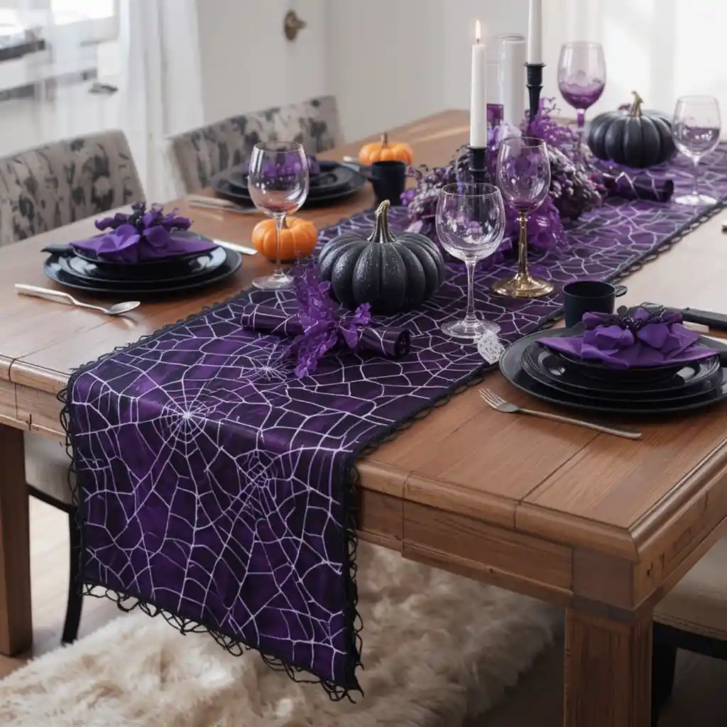 Swap out traditional orange for a purple spiderweb-patterned table runner to bring color to your Halloween feast. Pair it with black dinnerware and silver cutlery for a striking, witchy tablescape.
