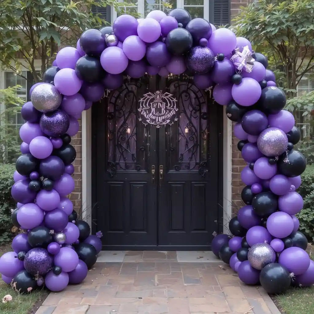 Create a balloon arch using purple and black balloons for party entrances or dessert tables. Add in metallic silver or glitter balloons for extra dimension and a glamorous Halloween backdrop.
