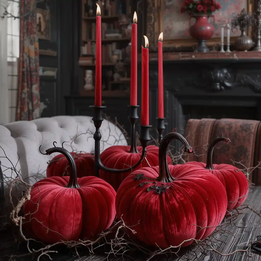 Swap traditional orange pumpkins for red velvet pumpkins with sleek black stems. Place them on coffee tables, mantels, or dining tables for a rich, luxurious twist on Halloween décor.