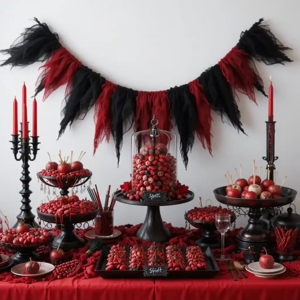 Set up a candy table using black bowls and trays filled with red and black treats like licorice, candy apples, and chocolate truffles. Label them with spooky names for extra fun.