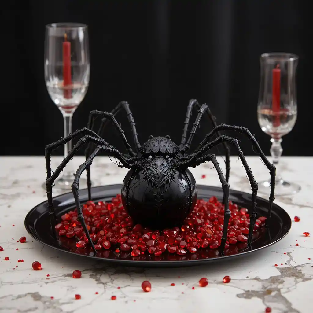Place a large decorative spider on a black platter and scatter red acrylic gems around it for a creepy yet stylish centerpiece that catches the light beautifully.