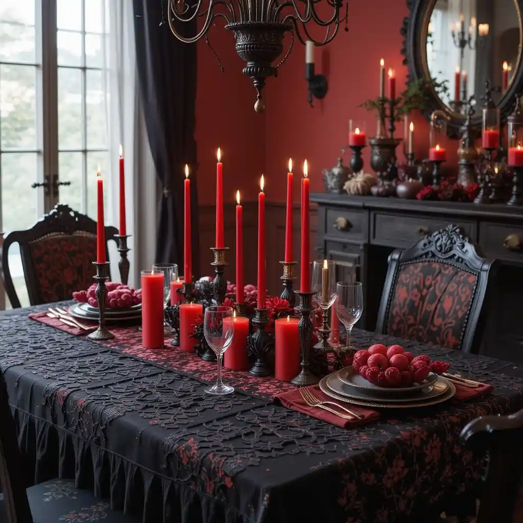 Cover your dining table with a black lace tablecloth and place bold red pillar or taper candles down the center. The candlelight will cast a warm, eerie glow during evening gatherings. Red and Black Halloween Décor Ideas