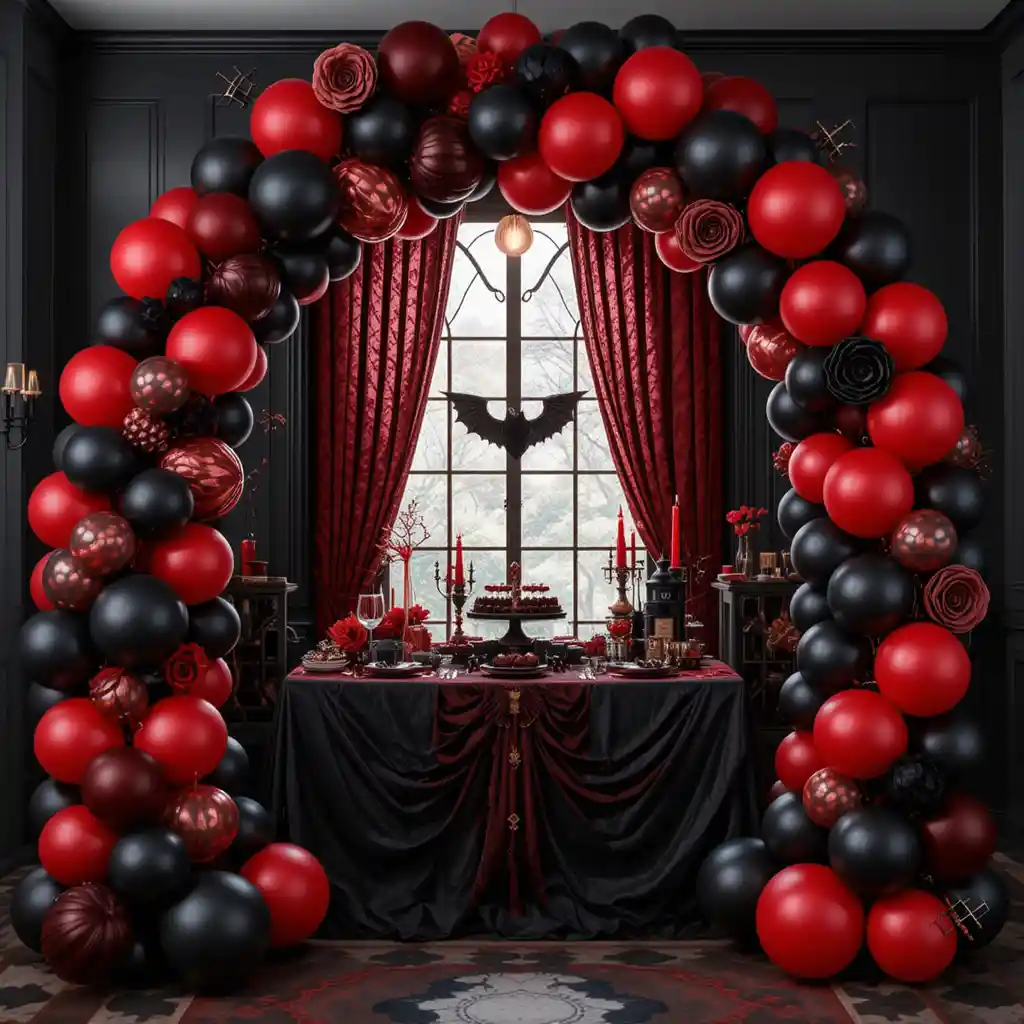 Create a balloon arch mixing matte black and deep red balloons for a striking party entrance or photo backdrop. Add a few metallic or glitter balloons to enhance the glamorous look.