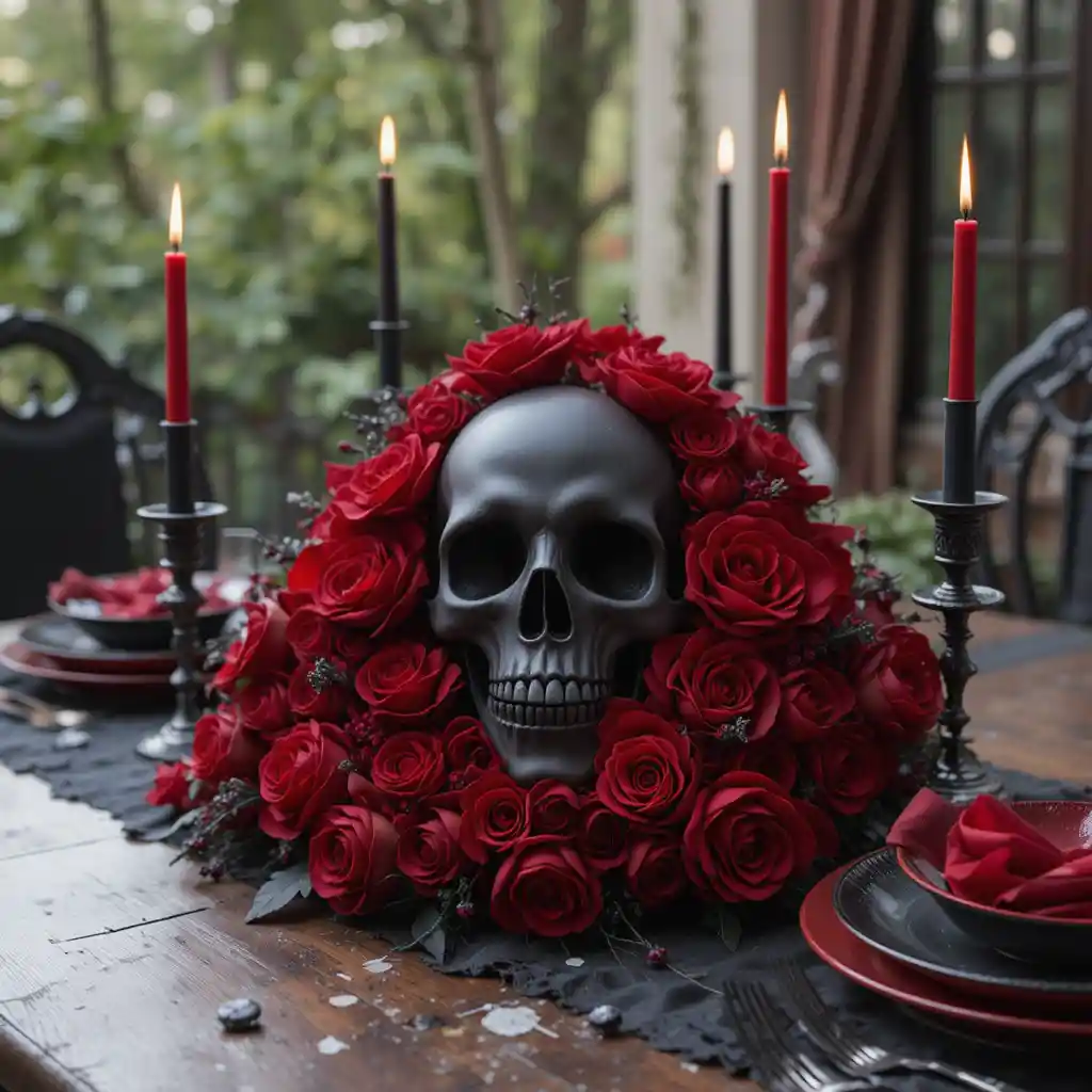 5. Black Skull Centerpiece with Red Flowers