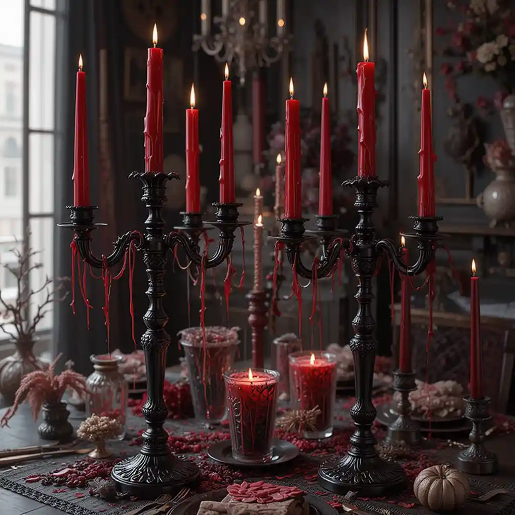 Use tall black candelabras with red candles designed to drip wax down the sides. The melting effect creates a hauntingly romantic feel for any Halloween dinner or display.