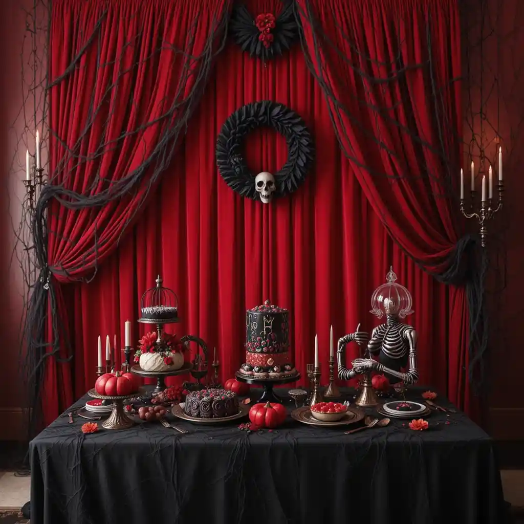 Hang red velvet curtains and add faux black cobwebs for a dramatic backdrop. This look works well behind dessert tables, photo walls, or as a theatrical living room display.