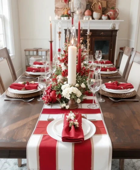 A bold striped runner instantly brings life to your table. Choose thick red and white stripes for a classic Christmas touch. Add simple white plates to balance the pattern while still keeping the festive look strong Red and White Christmas Table.