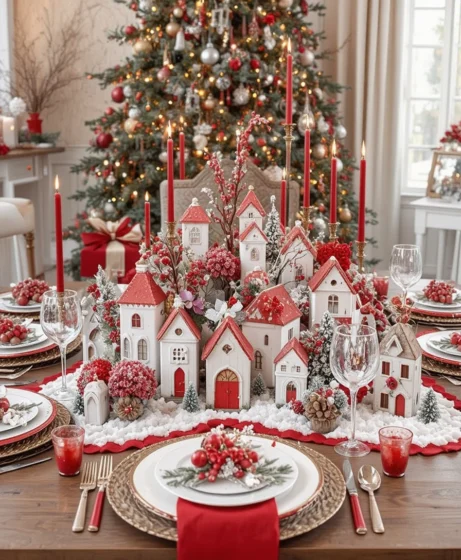 Small ceramic village houses with red roofs or doors make a charming centerpiece. Add faux snow for a wintery touch that invites a cozy Christmas mood.