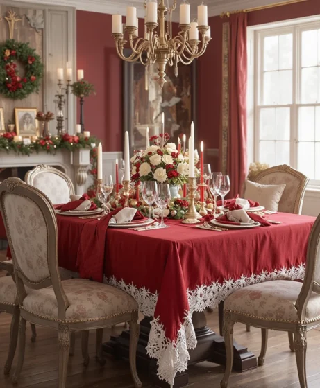 Choose a deep red linen cloth trimmed with white lace for a vintage-inspired look. It creates a soft, elegant contrast that feels traditional yet elevated.