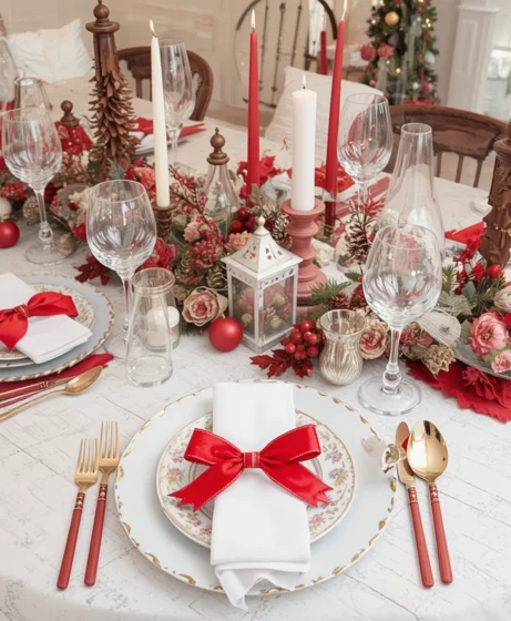Wrap simple red ribbon bows around your cutlery to introduce a charming detail. It’s an inexpensive touch that makes each place setting feel thoughtful and decorative Red and White Christmas Table.