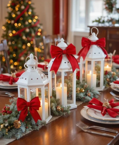 Small white lanterns filled with candles bring warmth to your table. Add red bows to the handles for a festive pop and a beautiful color contrast.