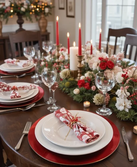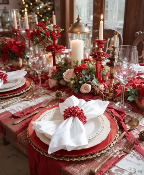 Use soft velvet red napkins wrapped with thin white satin ribbons for an elegant finishing detail. This adds luxury without overwhelming the table. The combination makes each place setting look polished and festive.