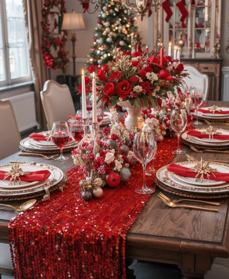 If you want sparkle, choose a red sequin runner. It reflects light beautifully and makes your table feel luxurious and eye-catching.