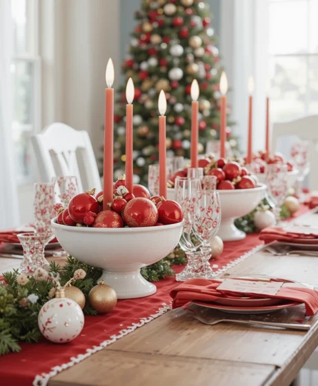 Place white ceramic bowls filled with glossy red ornaments along the table. This simple décor idea adds shine, volume, and color without overwhelming the space.