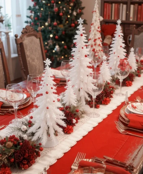 Add small white tabletop trees along the center and decorate them with tiny red ornaments. This brings height and playful detail to your table.