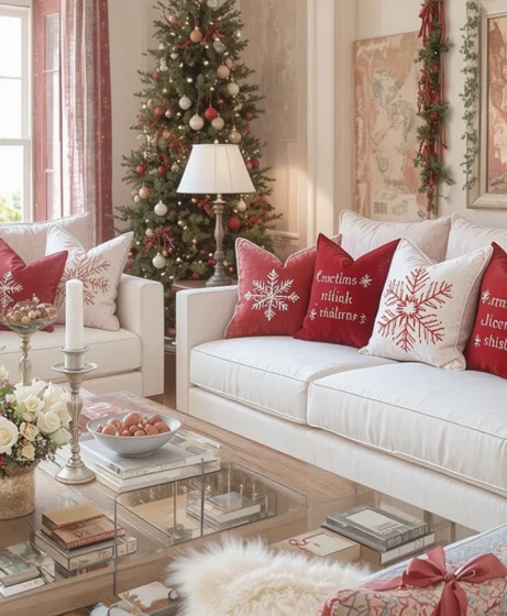 Adding bold red pillows with white snowflakes instantly boosts a holiday mood. They help brighten neutral sofas and create a soft, cheerful contrast. This quick change makes the space feel warm without overwhelming the Red & White Christmas Living Room.