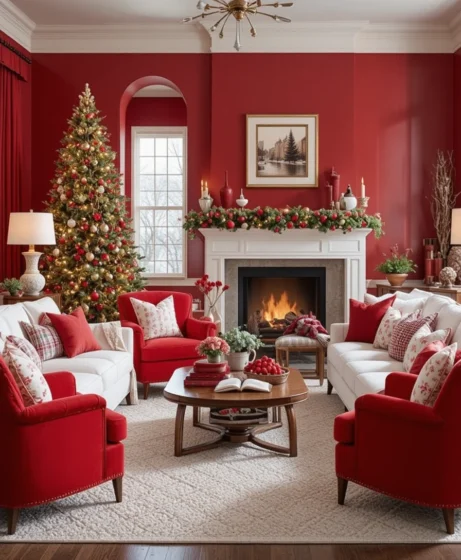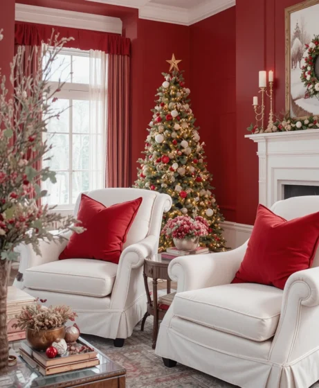 A white sofa paired with red accent chairs offers perfect color balance. The contrast feels polished and holiday-ready without being too bold. It creates a welcoming setup for family gatherings.