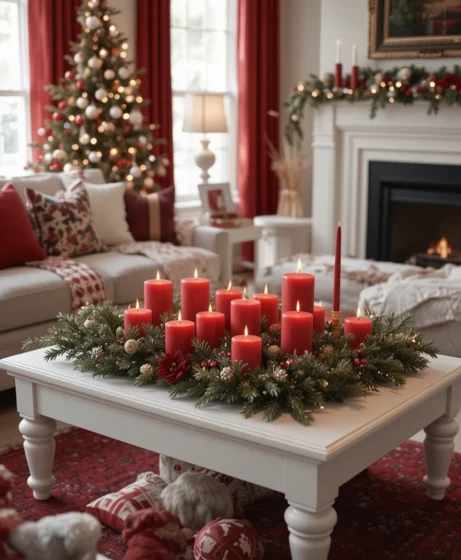 A white coffee table styled with red pillar candles is a simple yet stunning centerpiece. Combine it with greenery for extra holiday charm. It makes your seating area feel warm and complete.