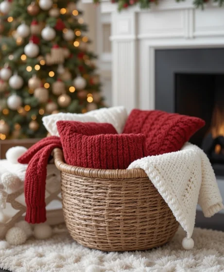 12. Red and White Knit Throws in a Basket