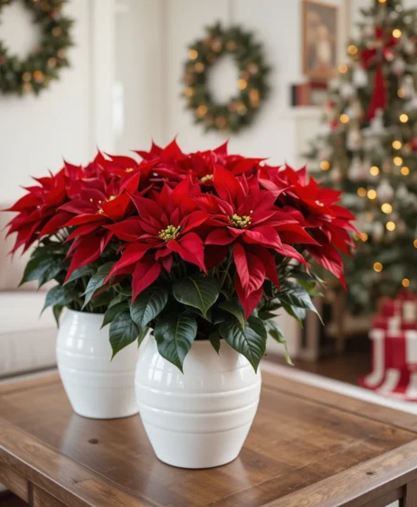 Displaying poinsettia plants in white pots adds a natural, lively vibe. The deep red leaves contrast beautifully against the white containers. This brings greenery and brightness into the room.
