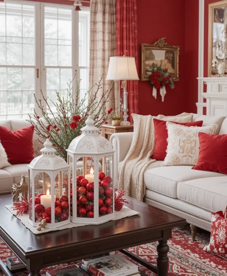 Placing white metal lanterns filled with red Christmas balls adds a chic decorative touch. They look beautiful on coffee tables or next to the sofa. The glow from LED candles inside enhances the cozy mood Red & White Christmas Living Room.