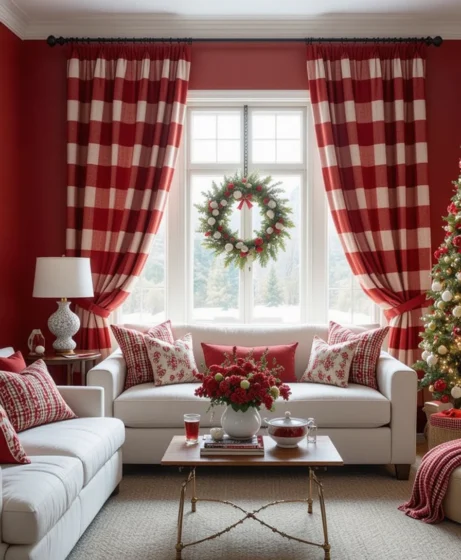 Switching to plaid holiday curtains instantly transforms the room. The pattern adds depth, warmth, and a festive cabin feel. This idea works especially well in neutral-colored living rooms.