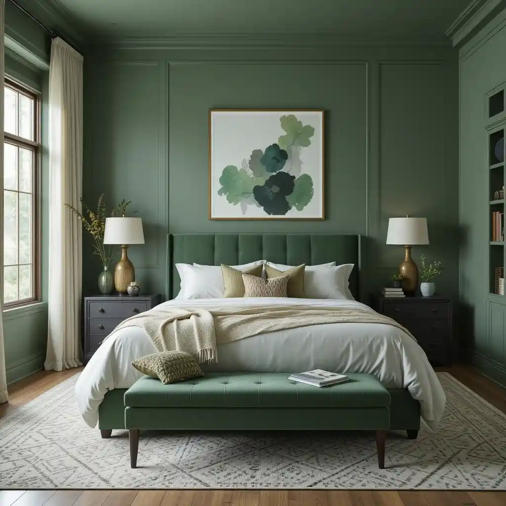Use rich forest or emerald green on one wall behind the bed to add depth and drama without overwhelming the room. Green Bedroom Ideas