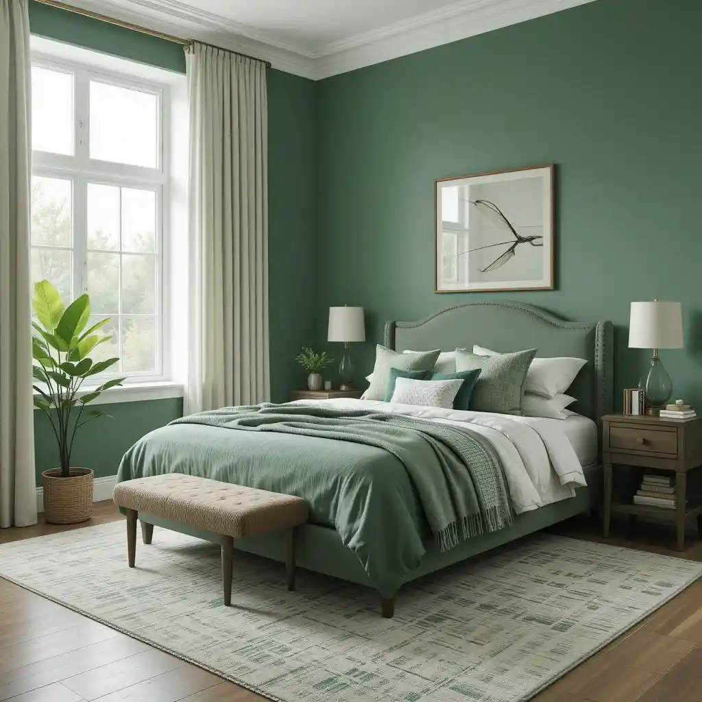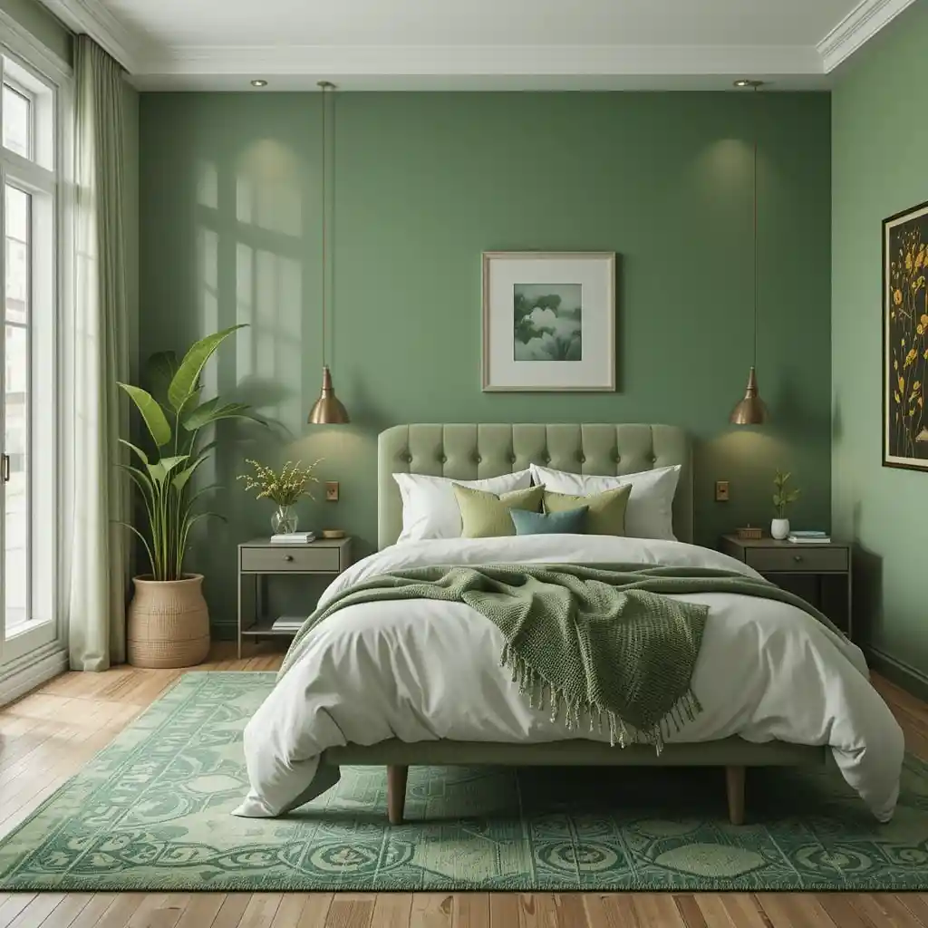 If you prefer a minimalist style, add a single green feature—like a plant, a blanket, or a statement cushion—for a pop of calm without clutter. Green Bedroom Ideas