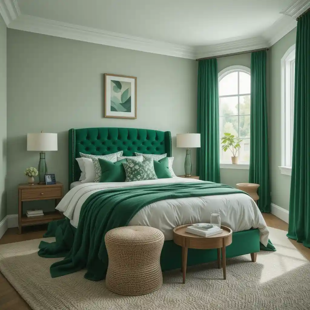 Add luxury with emerald green velvet throw pillows, curtains, or an upholstered headboard that brings richness and softness to your space. Green Bedroom Ideas