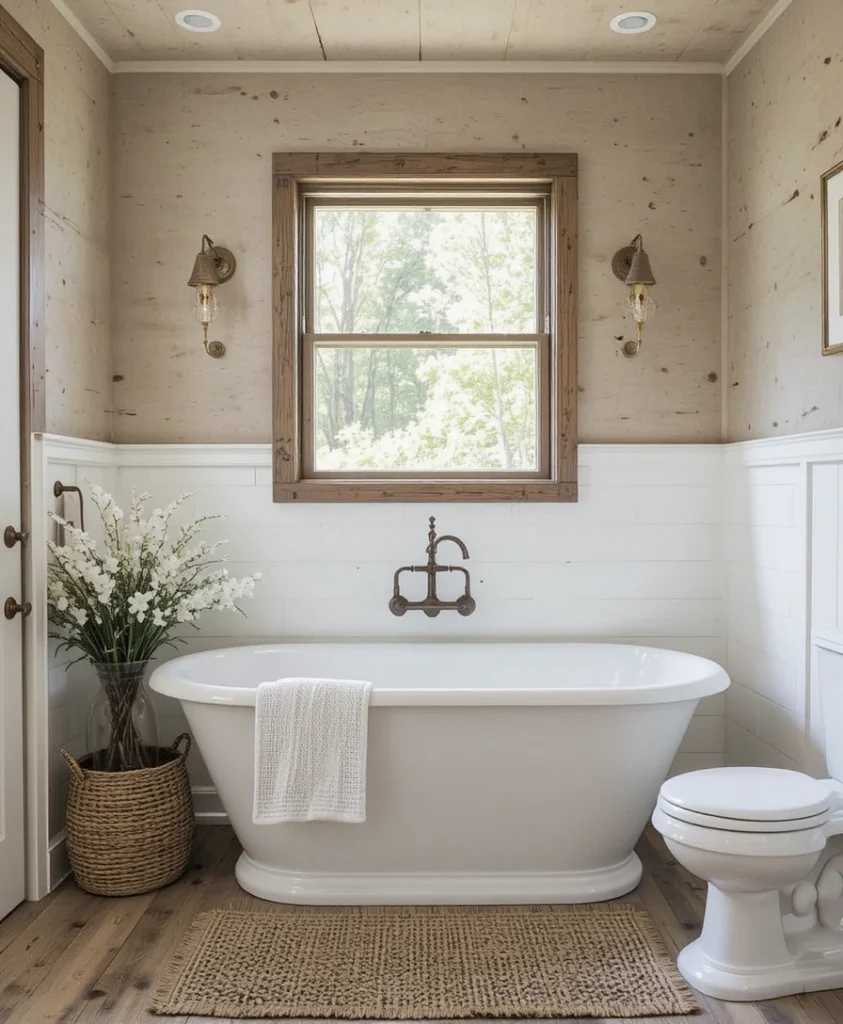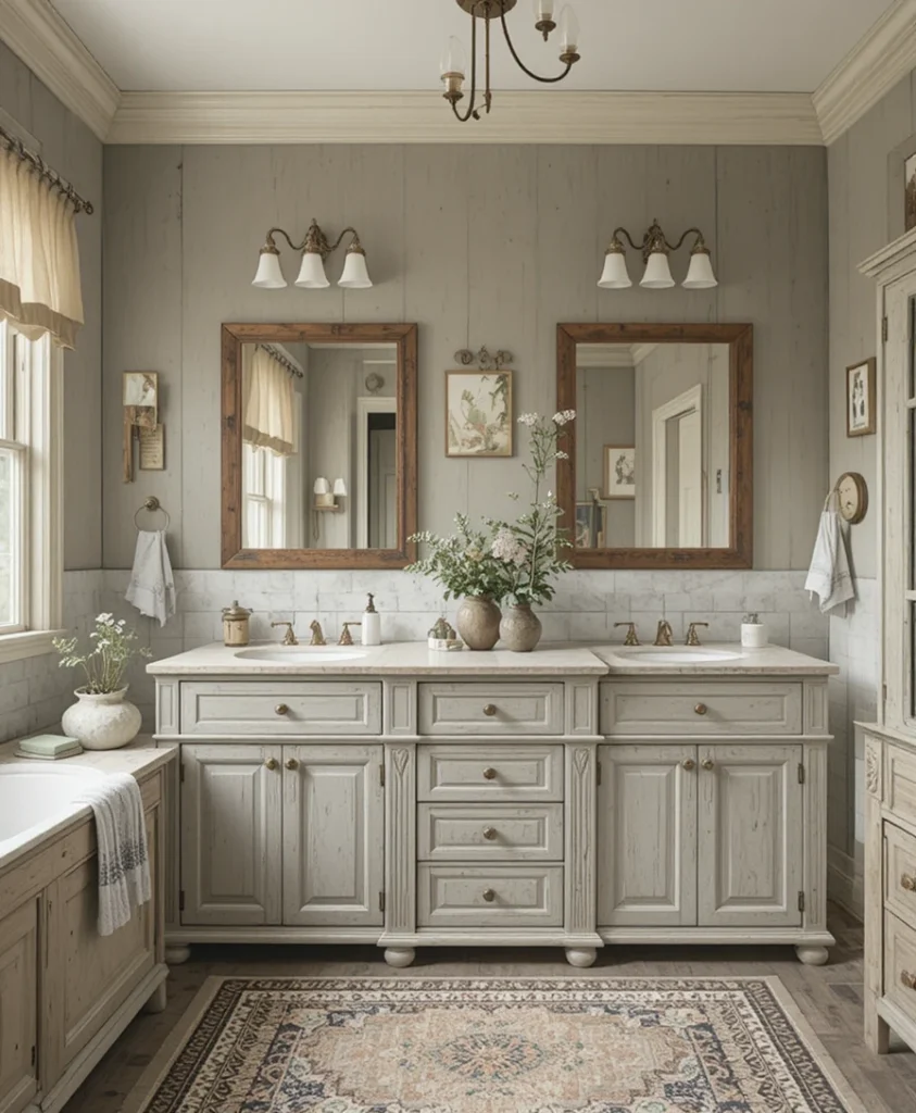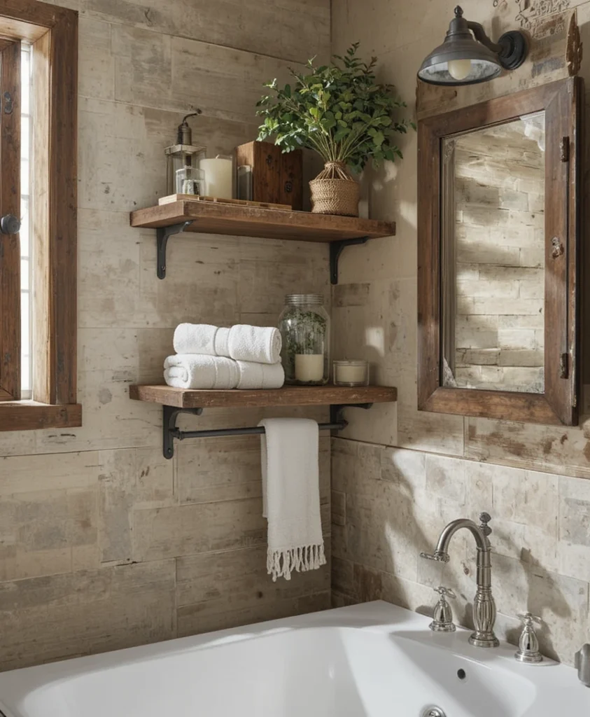 Add floating shelves made from weathered wood for a vintage feel. Use them to display rolled towels, candles, or glass jars filled with essentials.