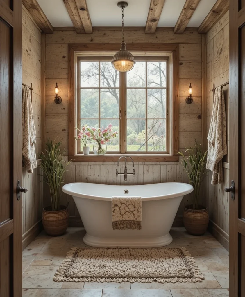 Add woven baskets, linen curtains, and soft rugs to make your bathroom feel warm and homey. The mix of textures completes that rustic charm perfectly. Rustic Bathroom