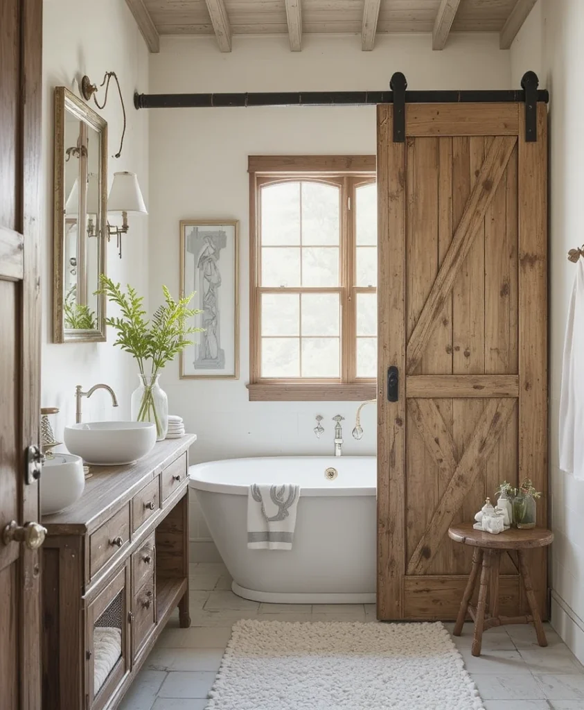 Replace traditional bathroom doors with a sliding barn-style door. It saves space and enhances that rustic farmhouse aesthetic instantly.