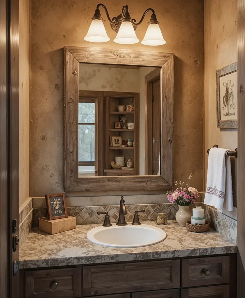 Add small potted plants, branches, or dried flowers for natural beauty. These details enhance the earthy tones of rustic bathrooms.