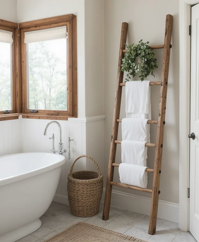 Replace modern towel bars with a wooden ladder rack. It’s practical, space-saving, and adds instant farmhouse charm. Rustic Bathroom