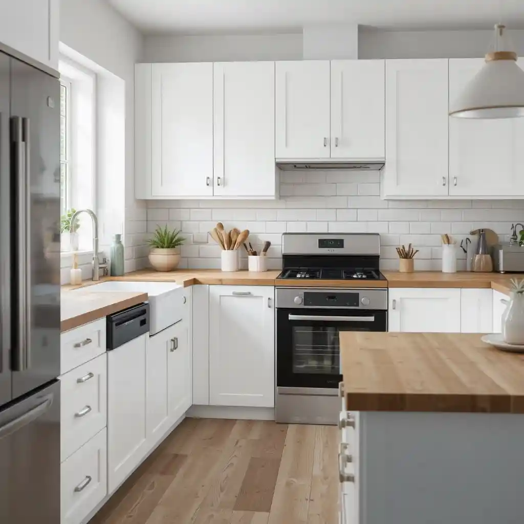 White IKEA cabinets paired with a warm wood countertop (like the KARLBY series) create a bright, clean aesthetic with natural charm.