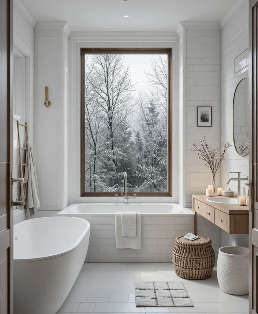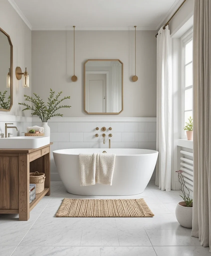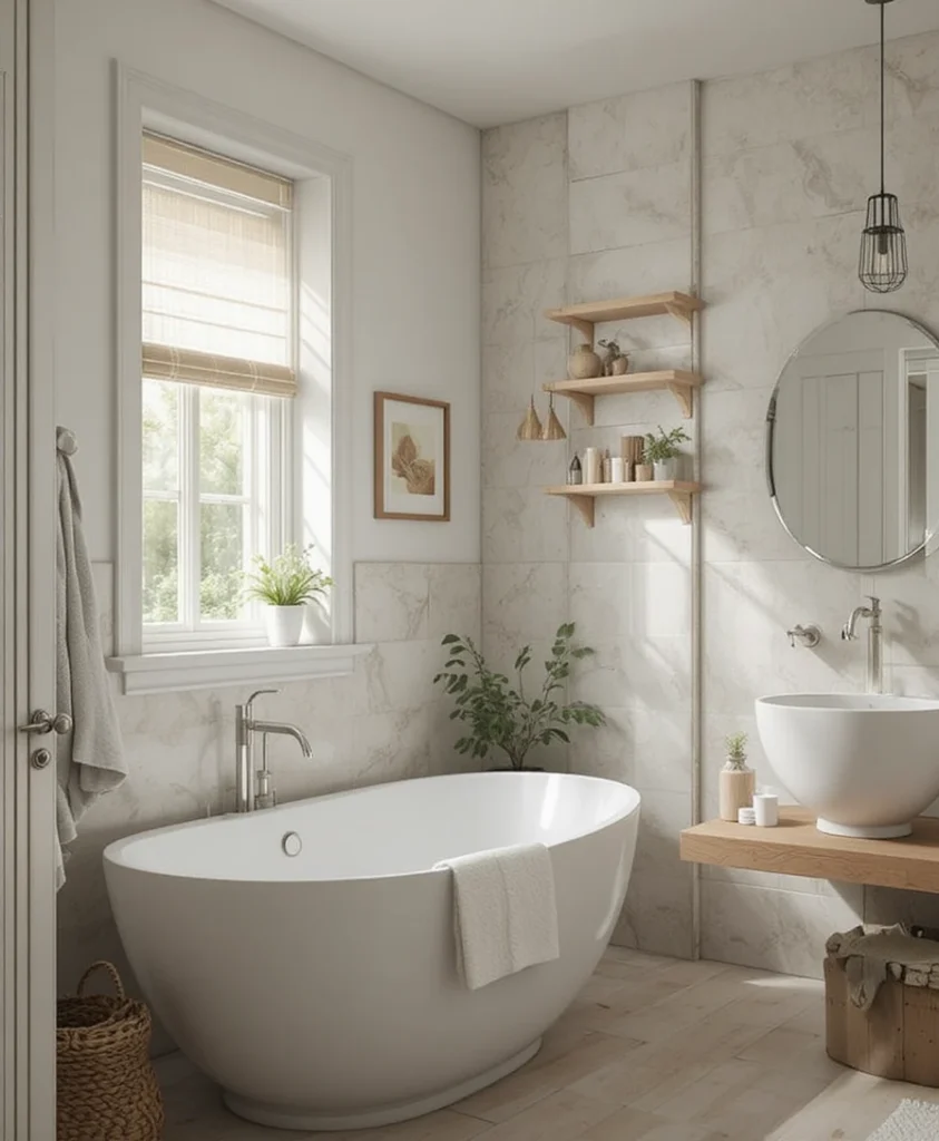 A freestanding compact bathtub in white or cream fits perfectly in small Scandi bathrooms. Pair it with wood stools and soft lighting for spa vibes.