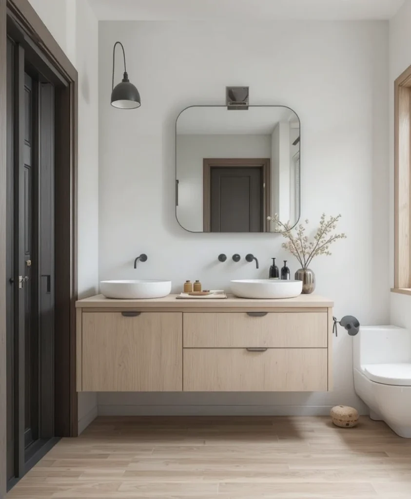 Choose a floating vanity with sleek drawers and minimal handles. It keeps the bathroom looking spacious and modern while offering discreet storage. Scandinavian Bathroom