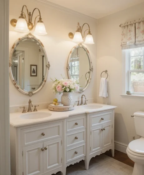 White vanities and vintage mirrors give bathrooms charm. Soft towels and subtle floral details complete the look. The space feels clean yet cozy.