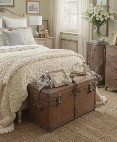 Vintage trunks offer storage with style. They work well at the foot of a bed or in living rooms. This adds function without losing charm Shabby Chic.