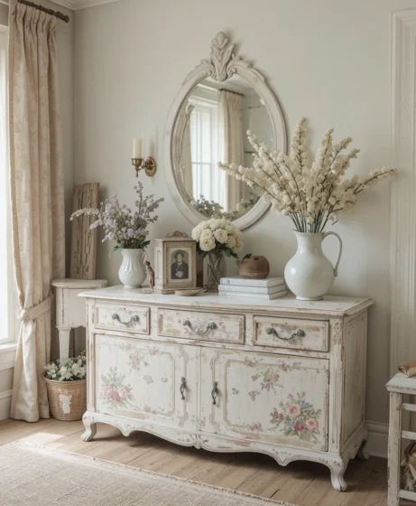 Antique mirrors with worn frames add elegance and depth. They reflect light and make rooms feel larger. This detail fits naturally into shabby chic interiors.