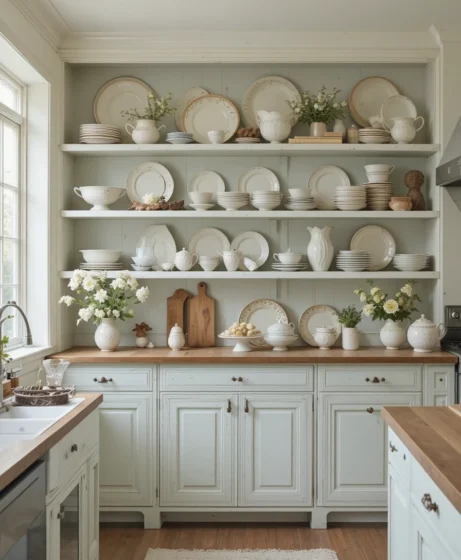 Open shelves displaying vintage dishes add warmth and personality. Soft-colored plates and glassware enhance the cozy look. This style keeps the kitchen inviting and practical Shabby Chic.