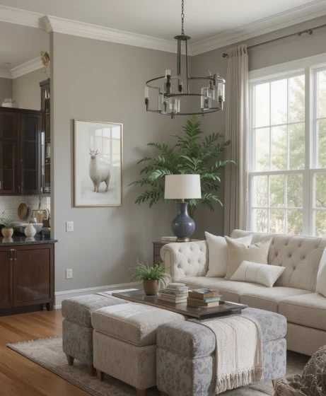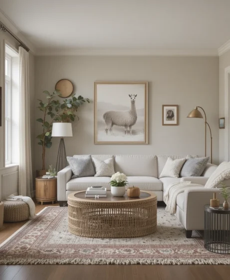 Layer rugs, pillows, and throws over Sherwin Williams Alpaca walls. The color enhances textures and creates a cozy, lived-in look.