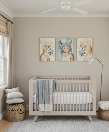 This greige tone is soft enough for nurseries. Sherwin Williams Alpaca creates a soothing environment for both parents and babies.