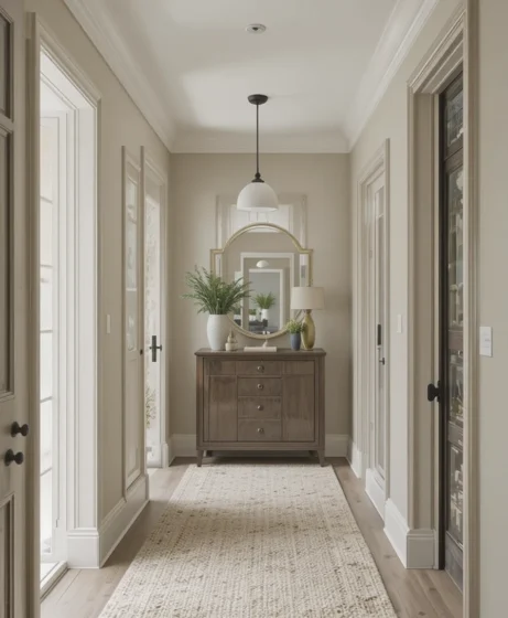 Narrow hallways benefit from this neutral tone. Sherwin Williams Alpaca reflects light softly, helping tight spaces appear more open and welcoming.
